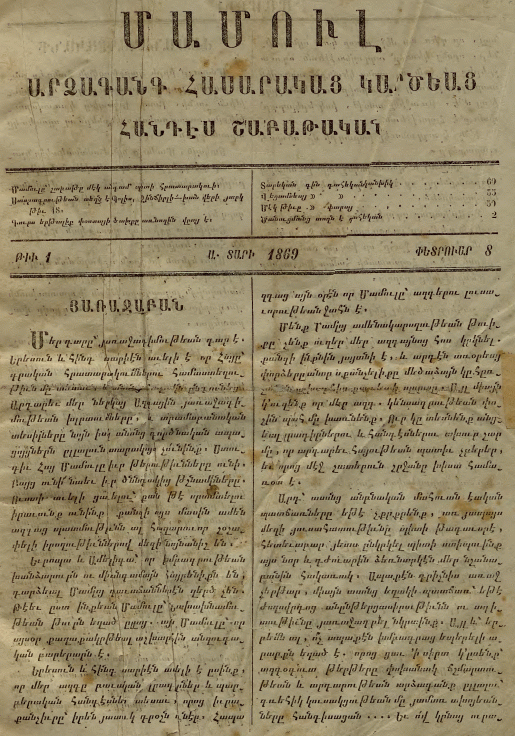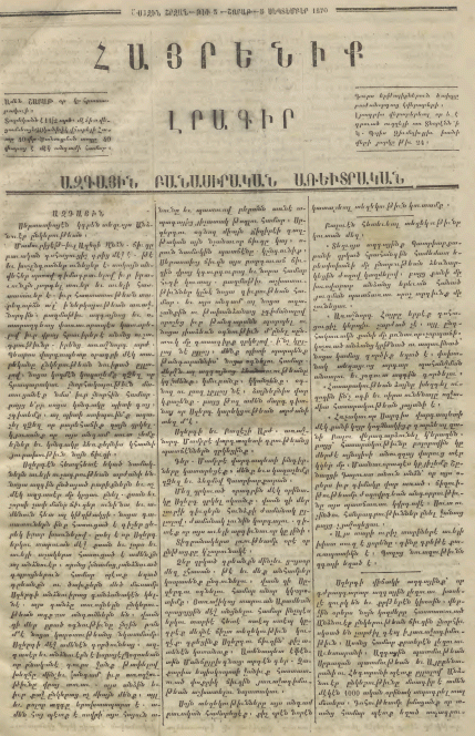 Publication details: Կ. Պօլիս ։ ՏՊԱԳՐՈՒԹԻՒՆ Յ. ԳԱՎԱՖԵԱՆ, ՏՊԱԳՐՈՒԹԻՒՆ Ս. ՄԻՔԱՅԷԼԵԱՆ, ՏՊԱԳՐՈՒԹԻՒՆ Յ. ԹՕԶԼԵԱՆ, ՏՊԱԳՐՈՒԹԻՒՆ Ե․ Մ․ ՏՆՏԵՍԵԱՆ, ՏՊԱԳՐՈՒԹԻՒՆ ՍԱՄՈՒԷԼ Ղ. ՊԱՐՏԻԶՊԱՆԵԱՆ ԵՒ ԸՆԿ., ՏՊԱԳՐՈՒԹԻՒՆ ՊՕՂՈՍԻ ՔԻՐԻՇՃԵԱՆ, 1875-1877